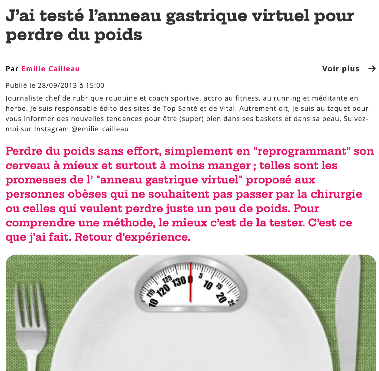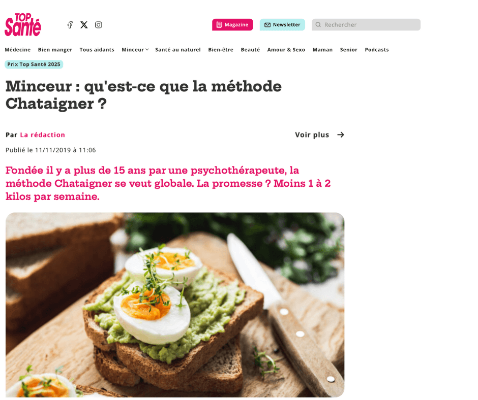 Depuis 2013, la Méthode Chataigner fait régulièrement parler d’elle dans les médias : articles de presse, magazines santé, interviews, dossiers spécial minceur, bien-être ou addictions sucrées (plus de 50 articles)… Au fil des années, journalistes et rédactions se sont intéressés à son approche globale – charge glycémique, neuromédiateurs, hypnose, gestion des émotions – qui permet de perdre du poids et de retrouver l’équilibre sans régime restrictif. Sur cette page, vous retrouvez une sélection de ces articles, reportages et parutions qui retracent l’évolution de la méthode et la confiance que lui accordent de plus en plus de professionnels et de lecteurs.